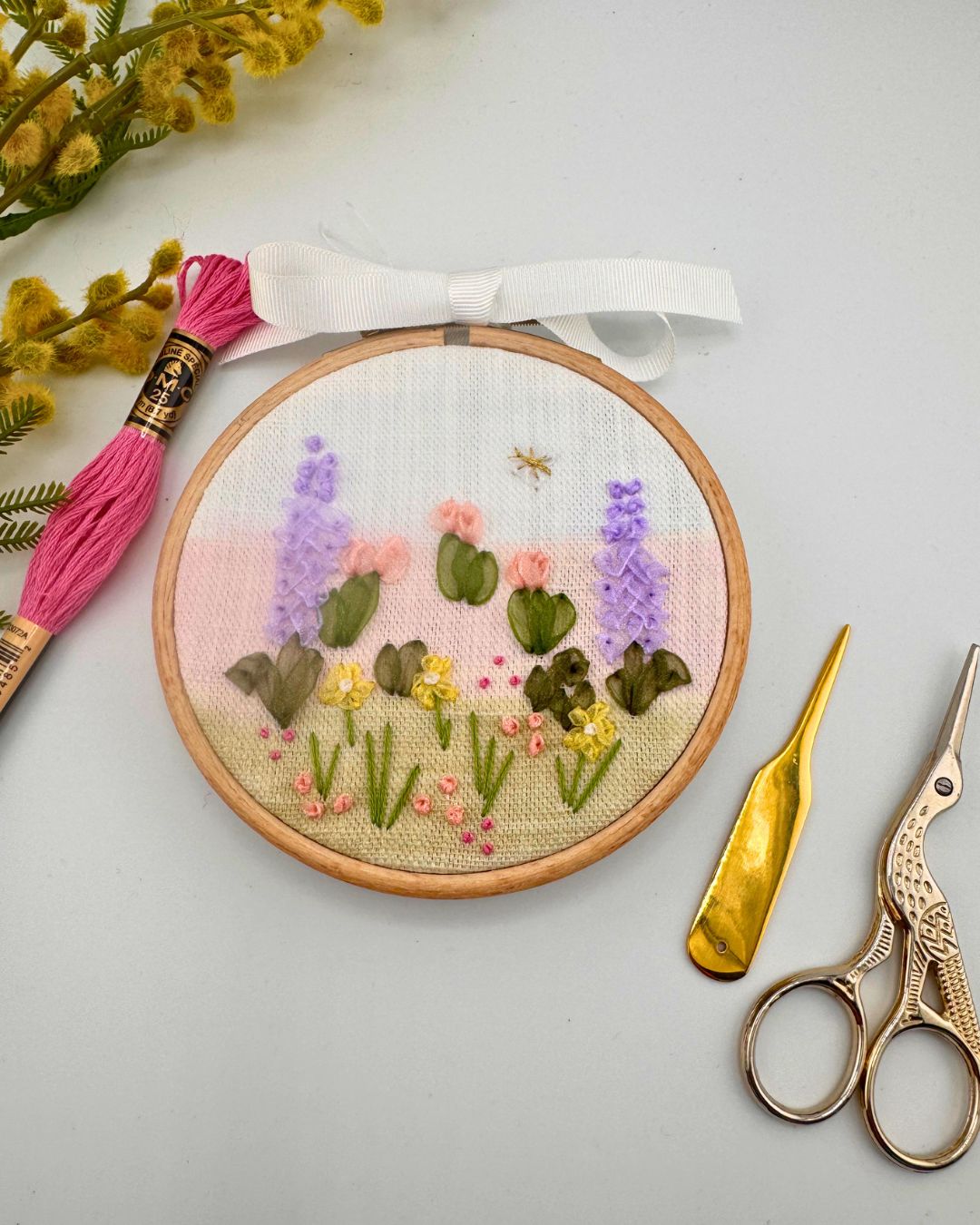 You’ll have a kit to take away including all the needles, ribbons and threads you need to finish your design as well as some pre recorded videos to help you.