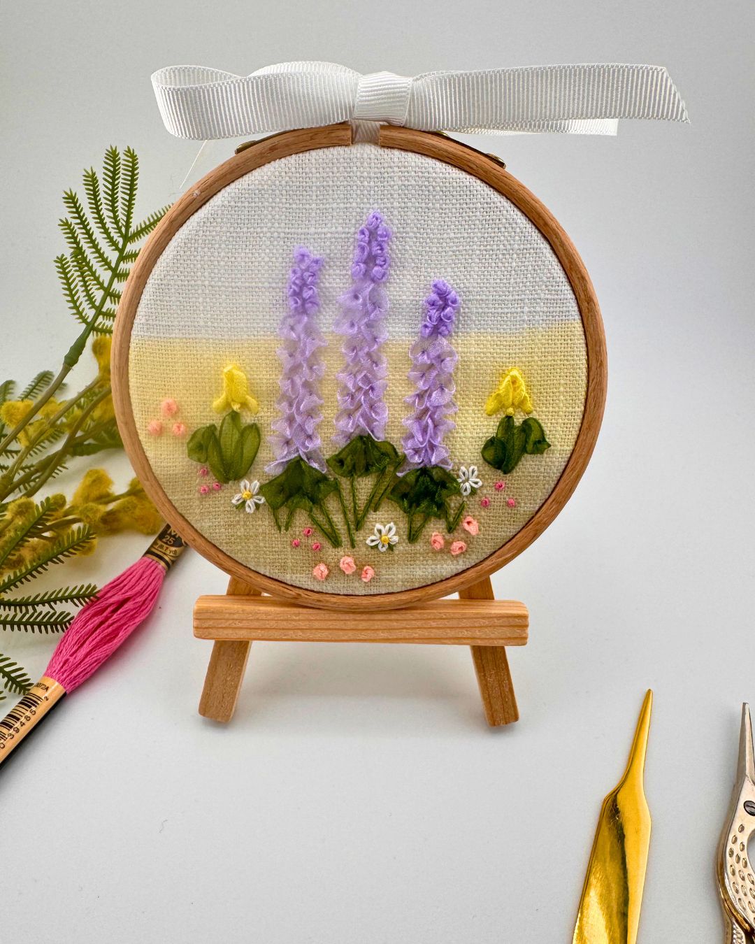 - 4-inch wooden embroidery hoop for stitching and display.