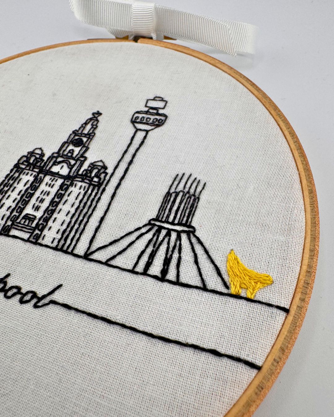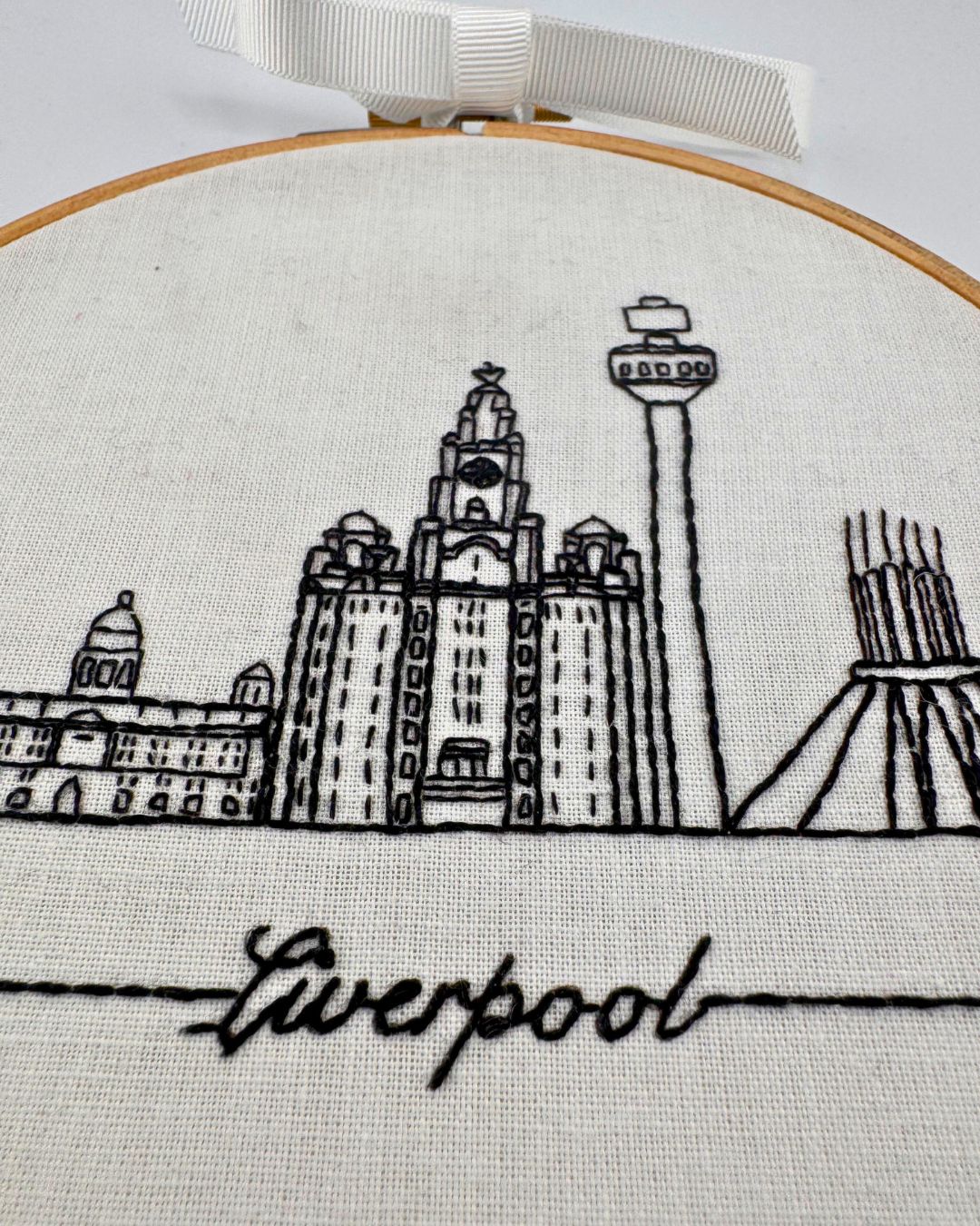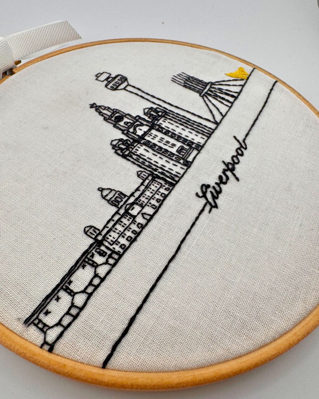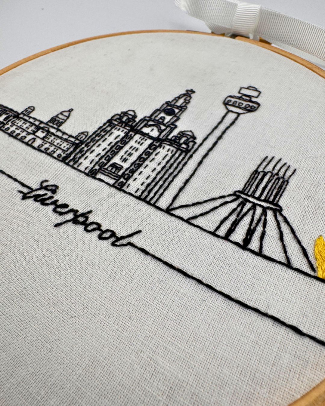 The Liverpool landscape embroidery kit is suitable for embroidery beginners. With this kit you’ll learn back stitch, straight stitch and french knots.