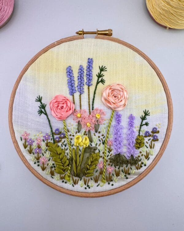 Unleash your creativity with my Ribbon work Flower garden Embroidery Kit, an ideal choice for adventurous beginners and seasoned stitchers alike. Whether you’re looking for a relaxing project to curl up on the sofa with or learn ribbon work embroidery techniques, this modern embroidery kit is designed to deliver a fun, satisfying experience—and a stunning piece of wall art to treasure.